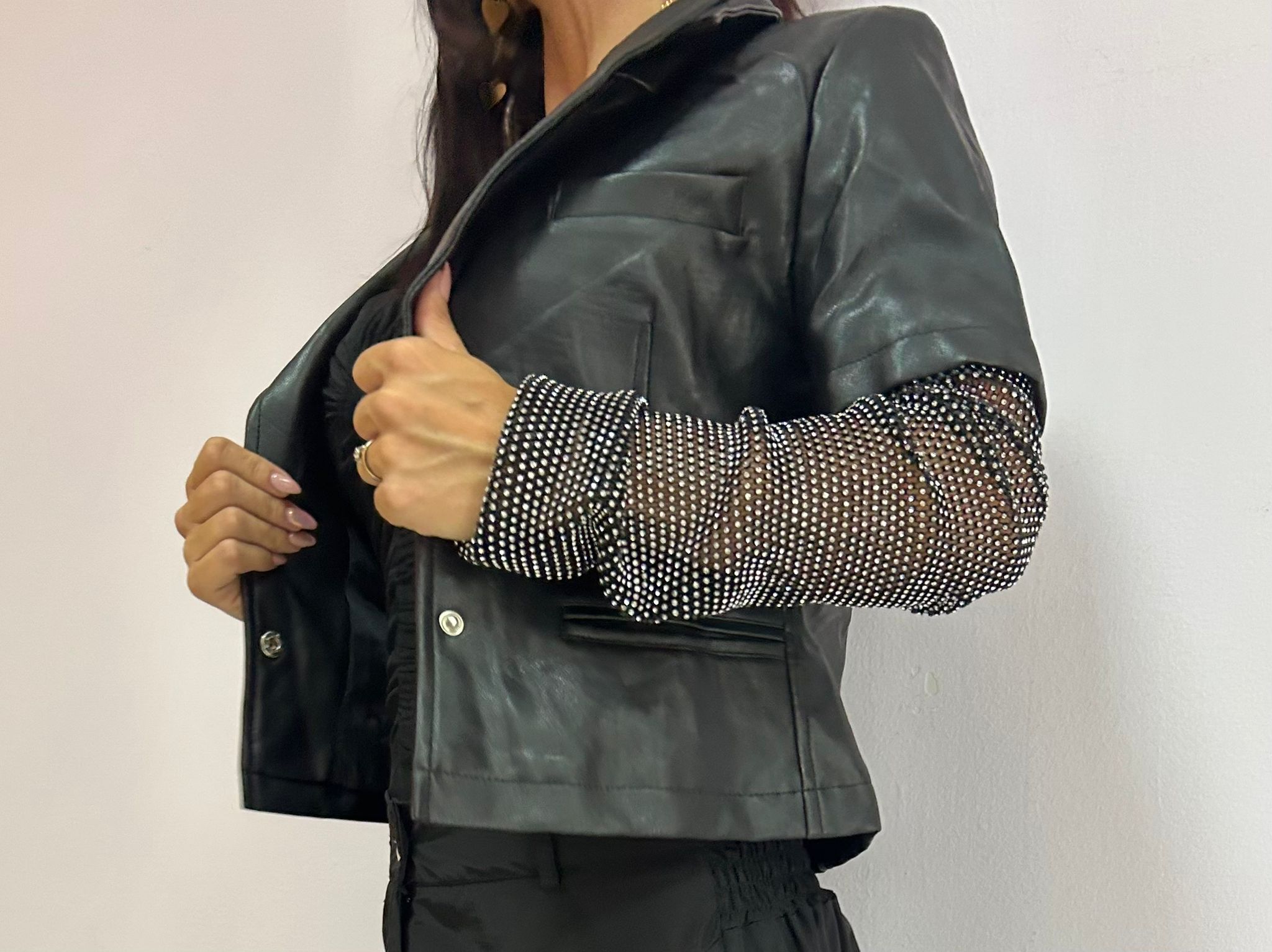 Scopri la giacca in ecopelle disponibile in doppia variante: beige e nera, caratterizzata da eleganti maniche interne in mesh brillanti ricoperte di strass. Il design sartoriale con revers classici e chiusura a bottone crea un look sofisticato, mentre le maniche scintillanti aggiungono un tocco glamour perfetto per chi ama distinguersi. Che tu scelga la versione beige, più delicata e luminosa, o la versione nera, più decisa e grintosa, questa giacca è il capo ideale per outfit moderni e ricercati.