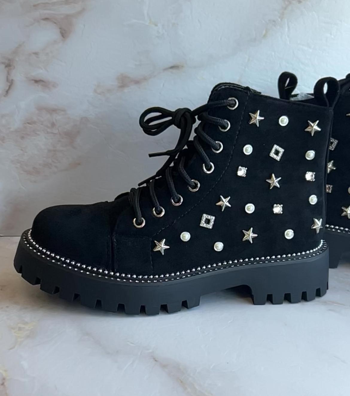 Lo stivaletto nero basso in camoscio è un must-have per chi ama un look grintoso e femminile allo stesso tempo. Realizzato in morbido materiale effetto camoscio, offre comfort e stile in ogni momento della giornata. Il design è arricchito da borchie metalliche, piccole perle decorative e dettagli brillanti che rendono questo modello unico e irresistibile.